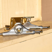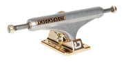 Independent Trucks Carlos Ribeiro Pro MiD trucks feature polished silver hanger with gold foil pad printed and laser etched logos, gold chrome plated baseplate, gold plated inverted kingpin, silver & gold hardware and white cushions and pivot cups.