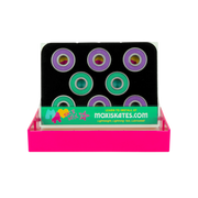 Moxi Mixtape Bearings are a two-toned 16 pack of 8mm bearings made for quad roller skates and packaged into a real cassette case. Each package contains 16 purple and teal friction-resistant covers. Lightweight and durable to withstand all types of skating including ramp skating, outdoor skating, rink and even roller derby. The balls are lubricated in the thinnest high-speed oil designed for quad skaters who crave a faster, more durable, and smooth forever roll experience, requiring a fraction of the cleanings that greased ones do. Mixtape bearings are pre-spun before they are packaged so they require no break-in session.