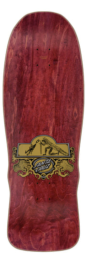 The Santa Cruz Skateboards Winkowski Archangel Pro Shaped deck features silver and gold metallic Winkowski Archangel artwork over teal stain deck bottom with smaller metallic gold Archangel artwork on burgundy stain deck top, on Erick's custom shape with a 15" wheelbase.